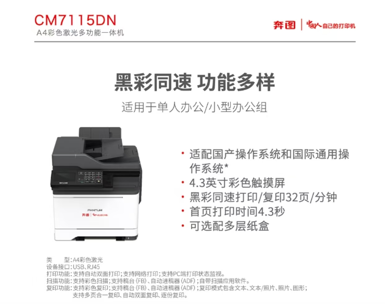 奔圖/PANTUM CM7115DN A4 彩色打印機(jī) 打印、復(fù)印、掃描